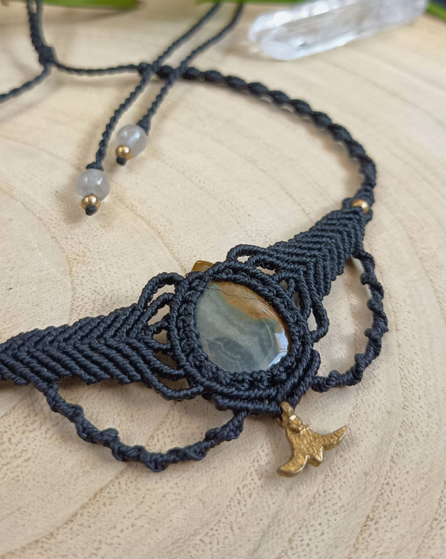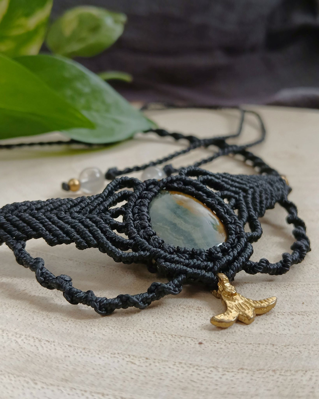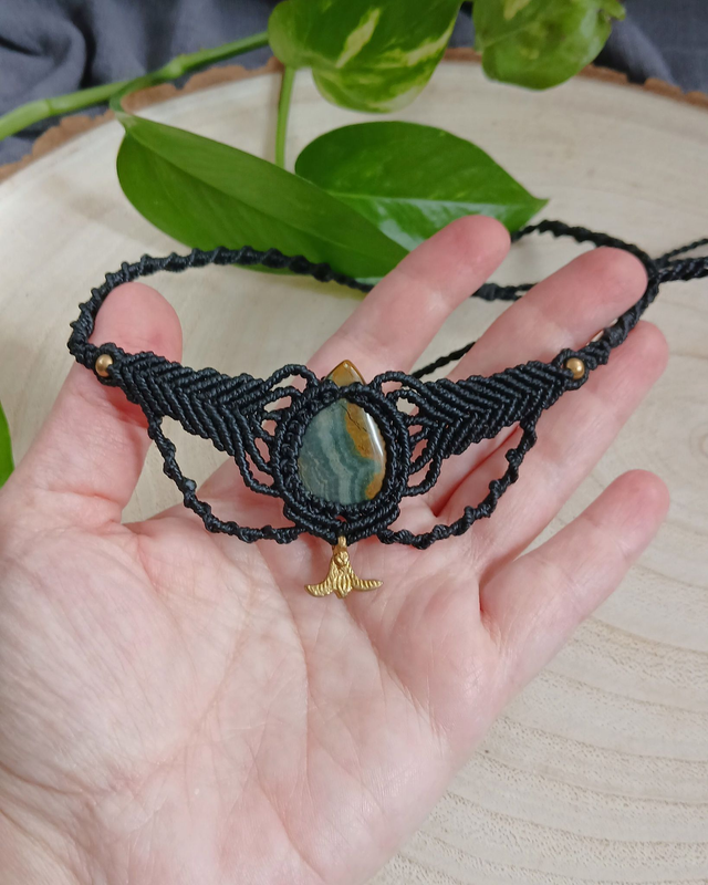 🌿 Material: Fio encerado de 1mm, pedra jaspe oceano e detalhes em latão