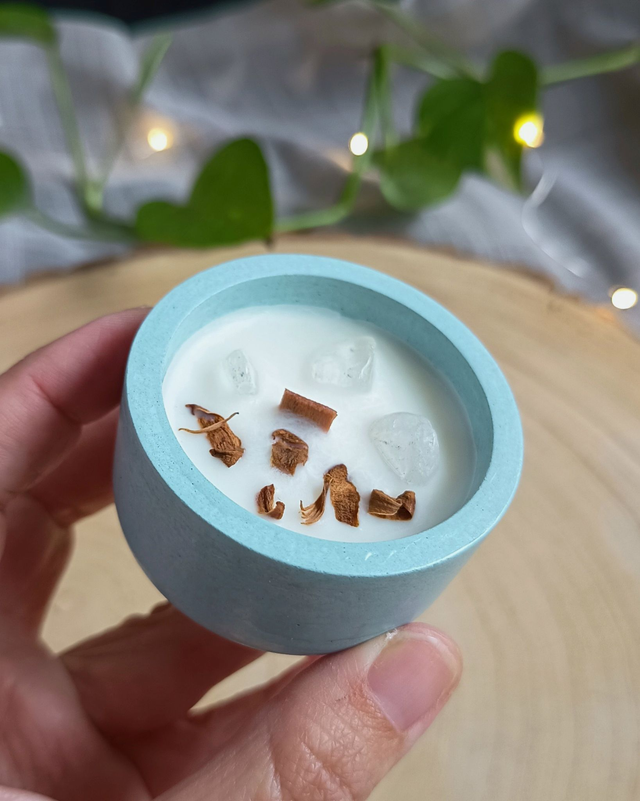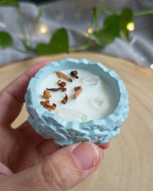 Feitas à mão com cera vegetal e óleos essenciais naturais, em recipientes de cimento moldados um a um, é uma luz simples e sincera para aquecer o inverno com leveza e presença.